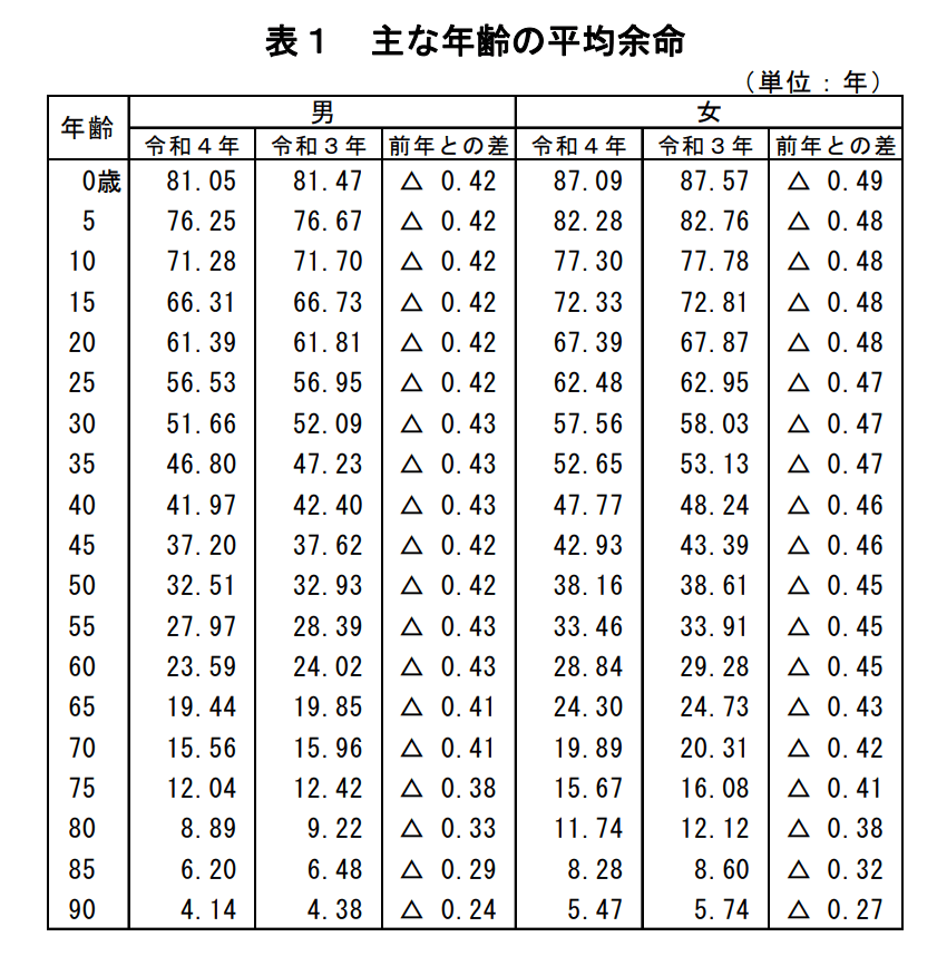 厚生労働省の「令和4年簡易生命表」によると、65歳時点の男性の平均余命は約20年、女性の場合はさらに長くなっています。