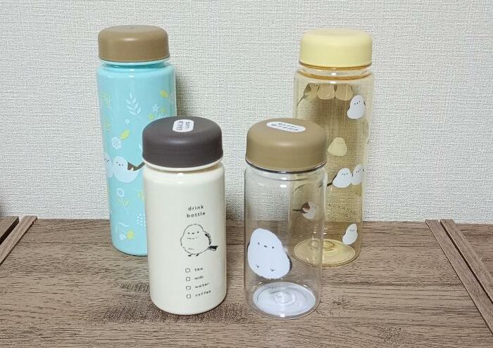【セリア】トリオのシマエナガが愛らしいです! 80度の常温の飲み物も入れられる500mlの水筒