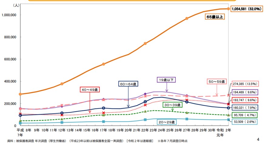 厚生労働省が2022年6月3日に公表した「生活保護制度の現状について」によると、65歳以上の受給者は増加し続けています。
