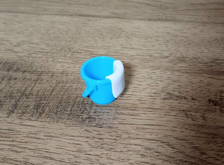 サイズは、バケツが29mm×25mm×H23mmです。雑巾1(折れ曲がっている方)は18mm×10mm×H15mmです。雑巾2は25mm×17mm×H1mmです。