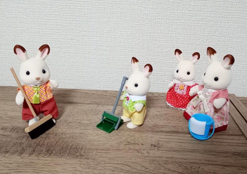 セリアで販売されている「ミニチュア掃除グッズ」を3つ紹介してきました。ほうきは柄が長すぎますが、それ以外のアイテムはシルバニアにシンデレラフィットしました。