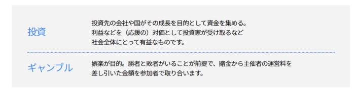 投資は一定の期間を想定して継続的に利益を得る目的で行うため、ギャンブルとは目的が異なるということになります。