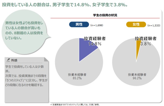 三菱UFJ信託銀行が公表している18歳以上の大学生、大学院生、専門・専修学校生等を対象に行った投資に対する意識調査によると、投資をしたことがある人は男性で14.8%、女性で3.8%となっています。