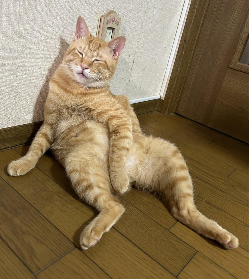 壁にもたれ掛かりながら後ろ足を前方に伸ばしています。脱力感のある手のポジショニングも愛らしいポイント。まるで「座椅子に身をあずけて休息する人間」のような格好に思わず笑みがこぼれます……!