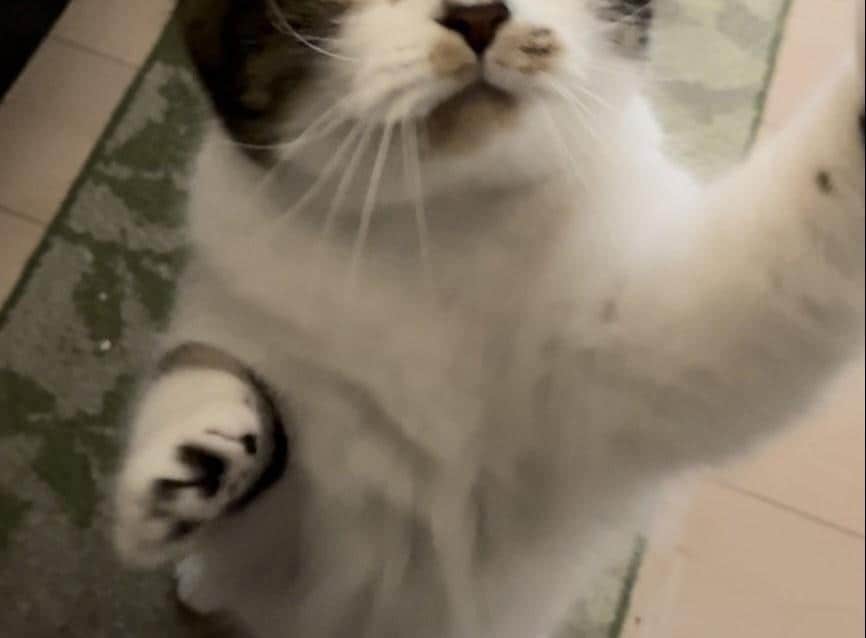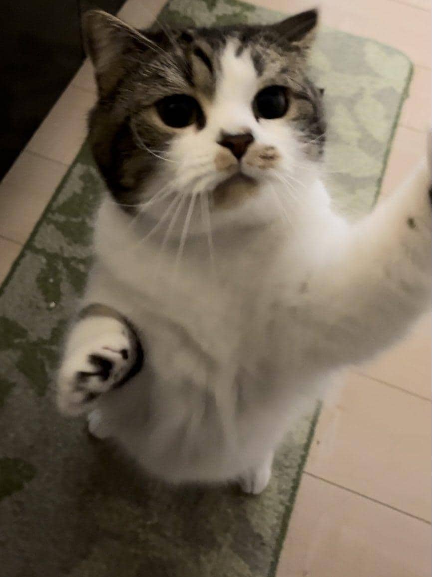 そこに写っているのは1匹の猫ちゃん。「おにく」くんという男の子です。おにくくんは両足を床につけて、ひょっこりと立ち上がっています。そして手を伸ばして、帰宅した飼い主さんを「チョンチョン」しているようです……!