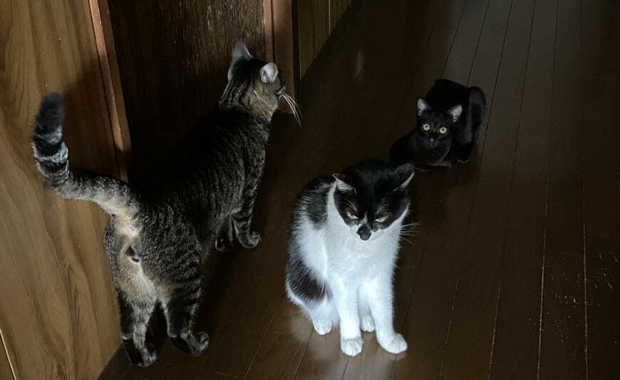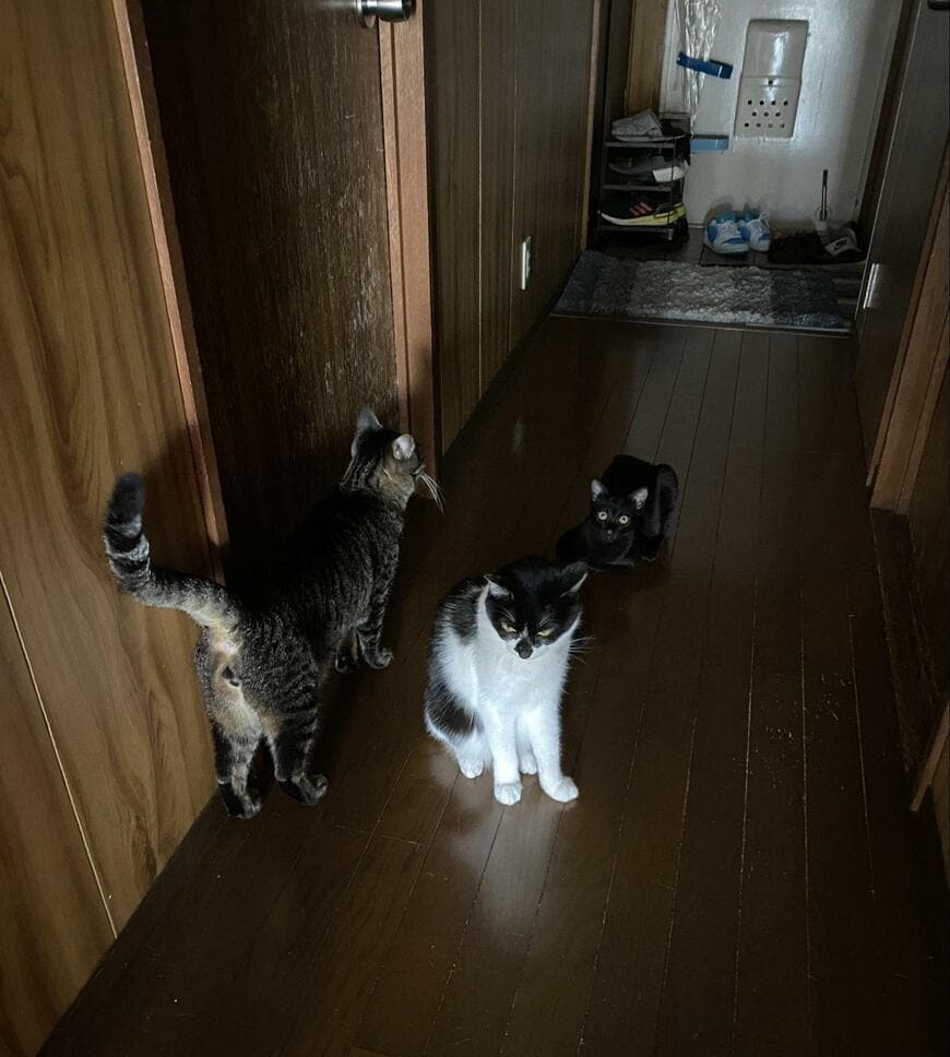 写っているのは、玄関に向かう途中のスペースに集合する猫ちゃん。黒猫の「コンブ」くんと、キジトラ猫の「シイタケ」くん、ハチワレ猫の「モズク」ちゃんです。