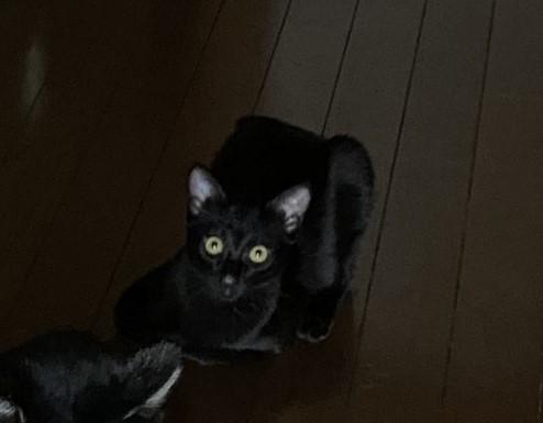 最年少のコンブくんは、真っ黒なボディを丸めて香箱座りしています。パッと見開いた黄金色の瞳が光っていて、どことなく迫力のある佇まいに。