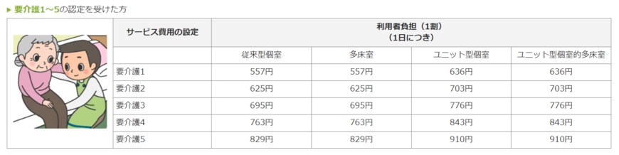 具体的には、従来型多床室の利用料が月額8〜9万円に対し、ユニット型の利用料は月額12〜14万円です。ユニット型に入所した場合の自己負担は、多床室より月額4〜5万円高くなります(※)。