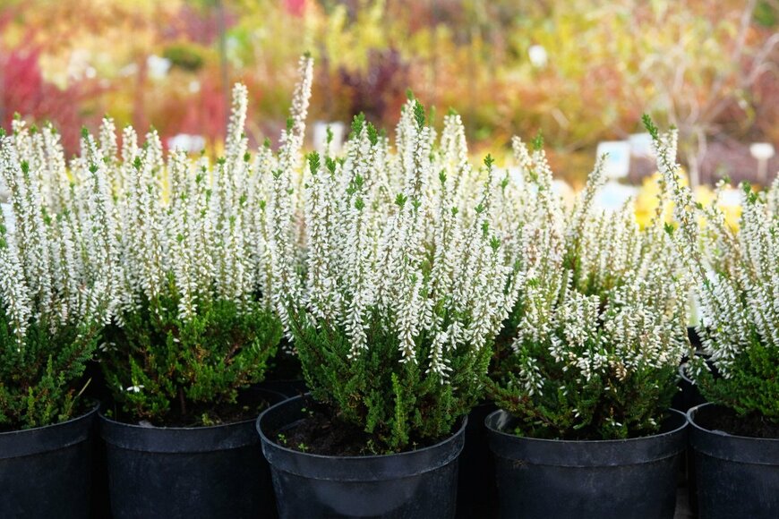 常緑低木のカルーナは寄せ植えにも重宝する植物です。スッと伸びた茎に沿って咲く花穂が繊細で、パンジー・ビオラとバランスよく植えられます。