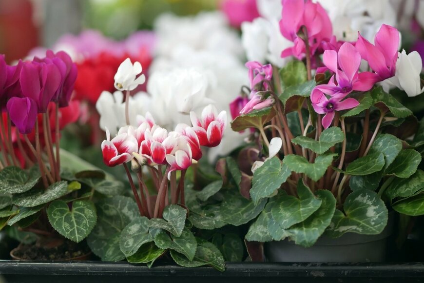 レッドやピンク、ホワイトの花弁が美しいガーデンシクラメンは、パンジー・ビオラに合わせやすい定番植物です。寄せ植えにすると株元の葉が痛みやすくなるので、水やりなどに注意が必要です。※参考価格:500~900円前後(3号ポット苗)