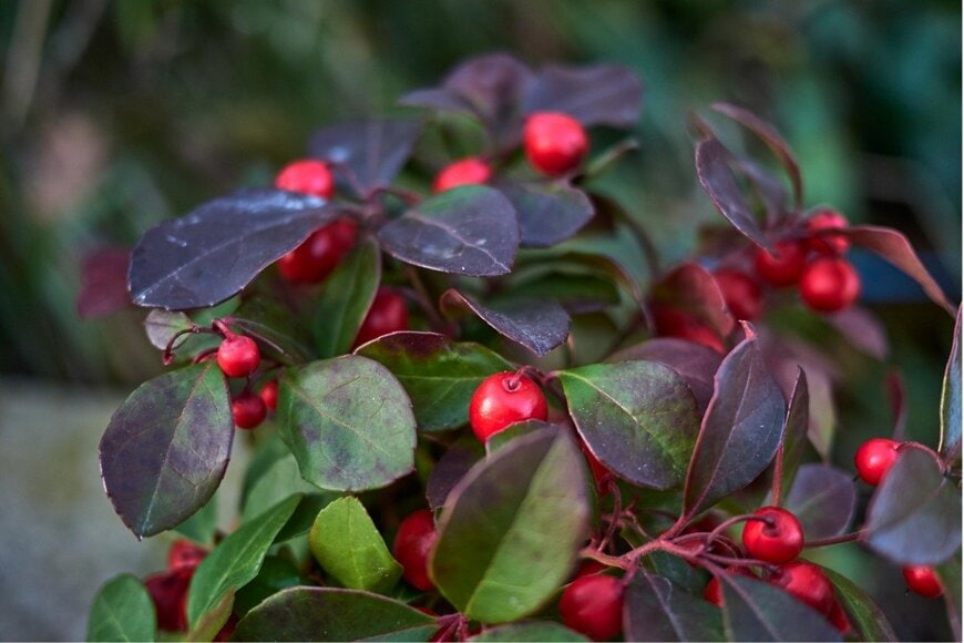 赤い実が可愛らしいチェッカーベリーは、パンジー・ビオラの寄せ植えを可愛らしく演出する植物です。