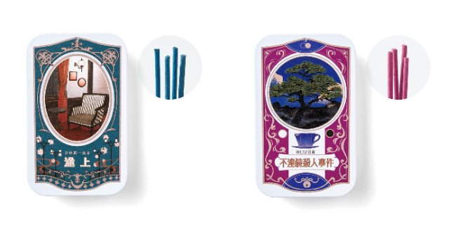 探偵小説のテーマやモチーフをイメージさせる「スティックタイプのお香」が、探偵小説の表紙のようなデザインの缶に入っています。
