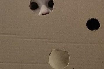 「前髪柄」の猫ちゃんが、段ボールの穴から覗く姿がX(旧Twitter)で注目を集めています。