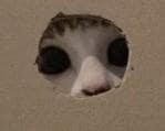 丸く開いた穴から「ジッ……」と顔を覗かせるセロイくん。チャームポイントの「前髪柄」がちらりと見えていて、愛らしさがいっそう引き立っている印象です……!お顔は「数cm」しか見えていないのに魅力が溢れ出ていて、つい心をくすぐられてしまいます。