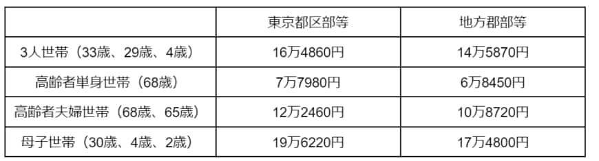 厚生労働省の「「生活保護制度」に関するQ&A」によると、最低生活費の目安は次の通りです。