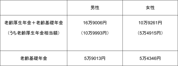 遺族年金などの計算のベースとなる「老齢厚生年金+老齢基礎年金」、老齢基礎年金の男女別の平均月額は以下のとおりです。