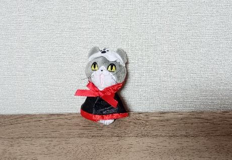 それぞれの衣装をぬいぐるみやフィギュアに着せてみました。こちらは「ハロウィンぬいぐるみコスチューム 襟付きマント」(JANコード4545244603410)です。