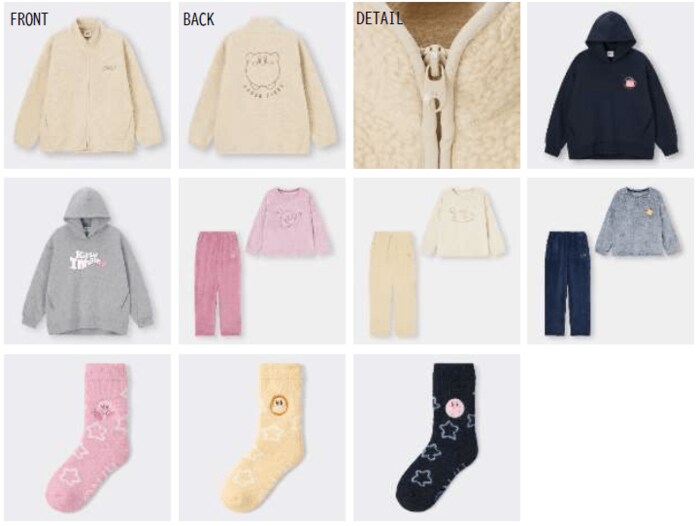 気になるラインナップですが、ウィメンズは外でもお家でも楽しめるアイテムが登場。カービィの“すいこみ”アクションに着目したウェアは、ロゴを吸い込んでいるグラフィックデザインのパーカや、カービィが吸い込む際の丸い口の形をしたオリジナルのファスナースライダーが付いたフリースジャケットなどがそろいました。また、キャラクターとワープスターをモチーフにしたラウンジウェアとルームソックスは、ふわふわな肌当たりで心地よくこれからの季節にピッタリ。