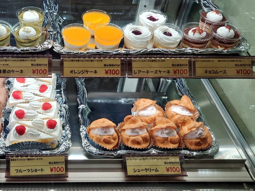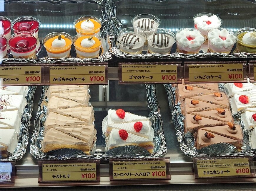 そこに映っているのは、ショーケースにずらりと並んだ様々な種類のケーキ。どちらもひとつひとつ丁寧に作られたかわいいケーキに見えますが、値札にはすべて100円(税込価格108円)と表示されています。