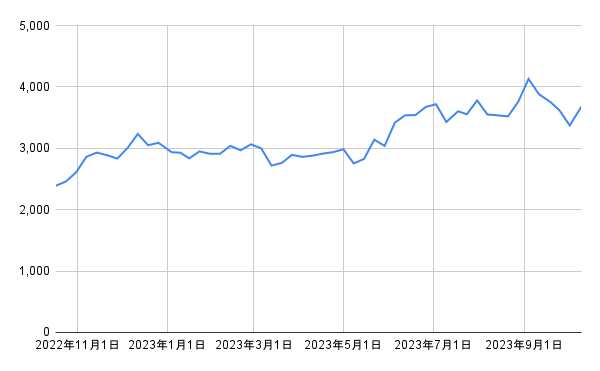 - 1年後の株価の終値: 3680円