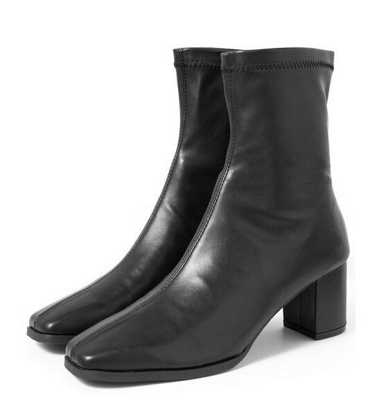 「スクエアトゥトストレッチブーツ」は、エレガントに見せてくれるやわらかいフェイクレザー素材。高さ6cmのヒールは太めで、歩きやすさも抜群!
