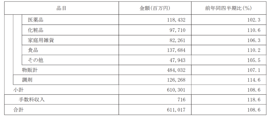 - 調剤:ドラッグストア内への併設推進による処方箋枚数の増加により前年同期比+14.6%