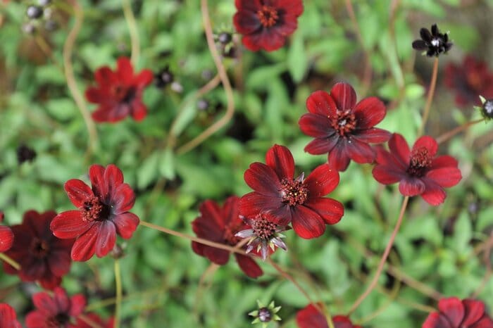 チョコレートコスモスは花色も香りもチョコレートそのもの。シックな色合いとビロードのような質感の花が、秋の風情をかもしだします。