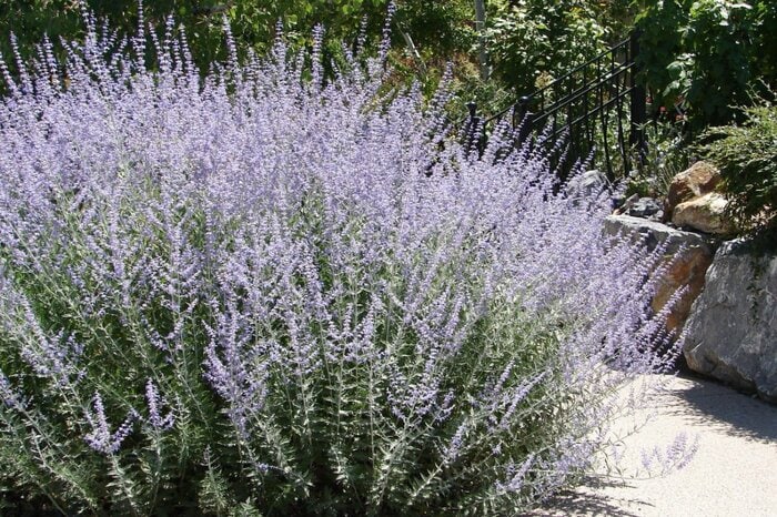 ロシアンセージはシルバーグリーンの葉が魅力的。7~10月にかけてブルーの花が咲き、清涼感あふれる多年草です。