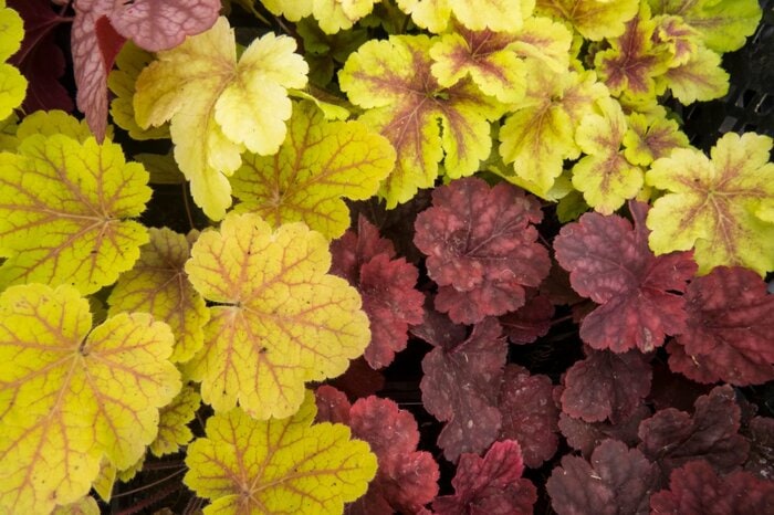 半日陰を好み、シェードガーデンには欠かせない定番植物のヒューケラ。品種改良でさまざまな葉色が生み出され、緑・赤・黄・オレンジ・ライムグリーンなど多彩です。