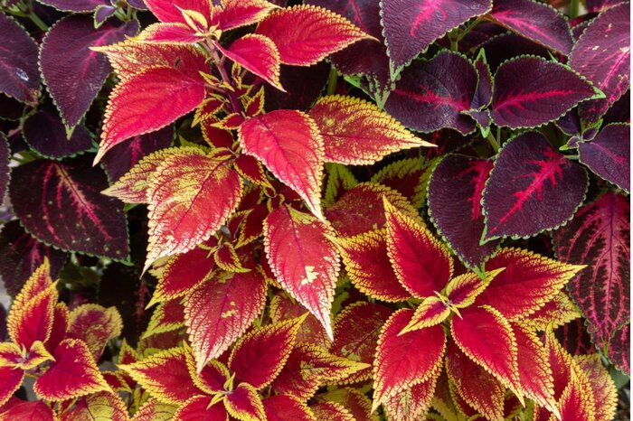 赤・ピンク・黄色など花のようにカラフルな葉色が魅力のコリウス。本来は多年草ですが、寒さにやや弱いため一年草として扱われています。
