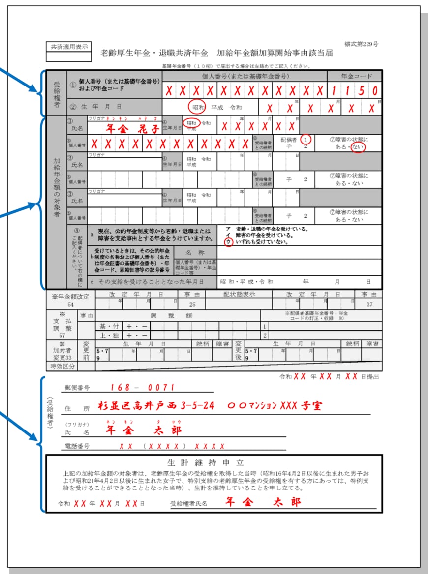 - 日本年金機構「【記入例】老齢厚生年金・退職共済年金 加給年金額加算開始事由該当届」