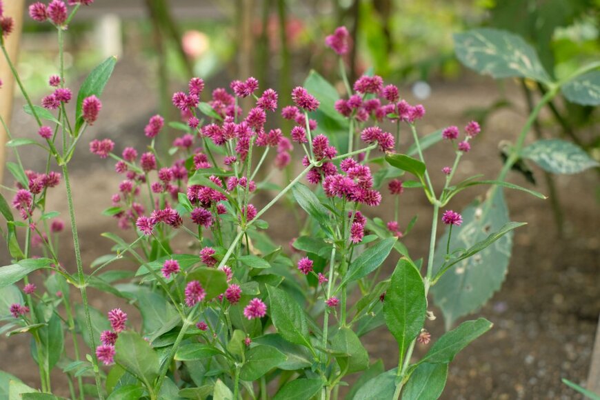濃いパープルやブラウンの小さな花がオシャレなセンニチコボウ。センニチコウより、ひと回り小さく、メインとして植えるより、寄せ植えのアクセントとして重宝する植物です。
