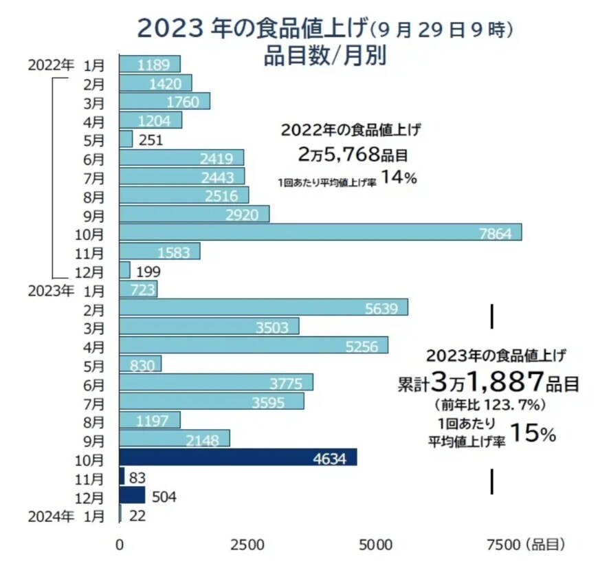 上記調査の結果、10月の飲食料品の値上げは4634品目となり、2023年で3番目に多い月となりました。