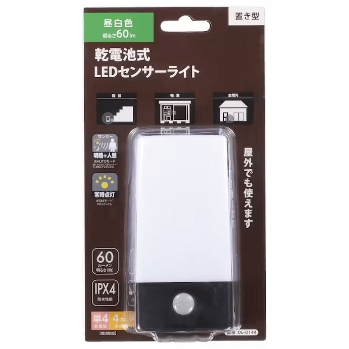 暗くなって人が近づくと自動点灯。玄関・クローゼット等に置いて使用できるセンサーライトです。LEDタイプで乾電池式なので、コンセントがない場所でも簡単に設置できます。また、屋外に置いておくこともできるので、内玄関や物置などでも活躍してくれそうです。