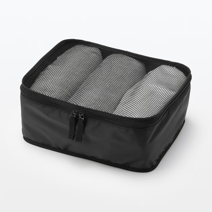 一部分がメッシュになっていることで、中身が見やすく通気性が抜群。収まりやすい角型で、バッグの空間がムダにならないのもポイントです。