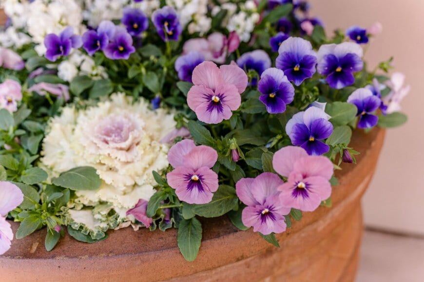 草花を組み合わせるときは、小さな花が咲く品種を選ぶとバランスを取りやすくなります。ホワイトのパンジー・ビオラ、ジュリアン、イベリス、ネメシアなどが合わせやすいでしょう。