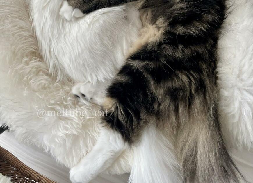 足先から尻尾のほうまで、ぴったりとくっつけるメルくんとマオくん。ふたりは普段からとっても仲良しだといいます。写真からも安心感と信頼がたっぷり伝わってきて、眺めているこちらの心も温まりますね。