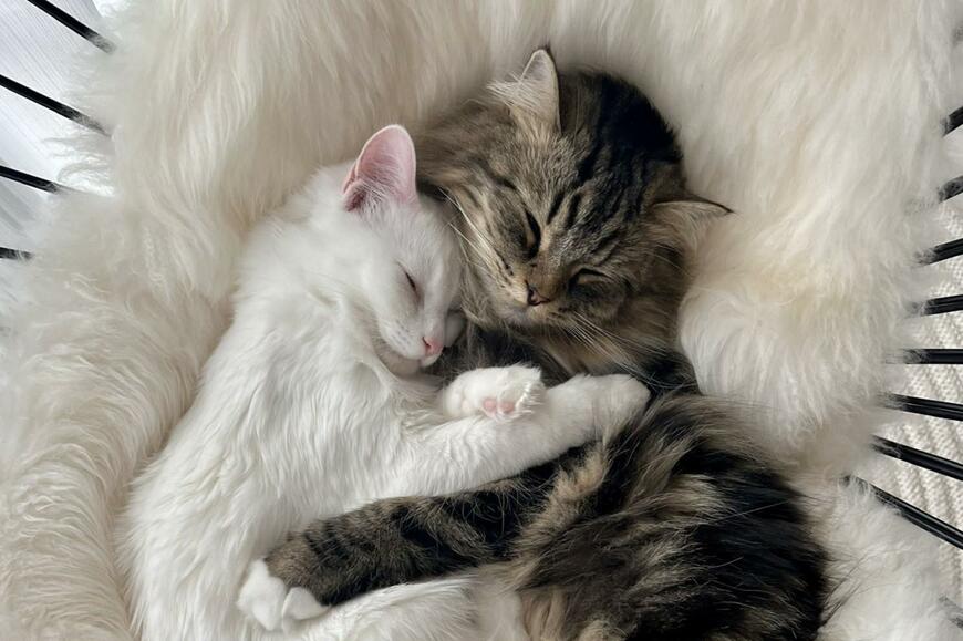 ふわふわの敷物の上で、身を寄せ合うようにして眠る2匹。メルくんは手と足でマオくんを包み込むような格好をしています。そこに身体を預けるようにするマオくん。