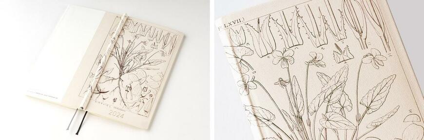 こちらは、ほぼ日手帳にピッタリ使える「カバー」です。牧野博士が1901年に描いた「コウシンソウ」の植物図がデザインに使われています。紫色の花びらが美しいです。