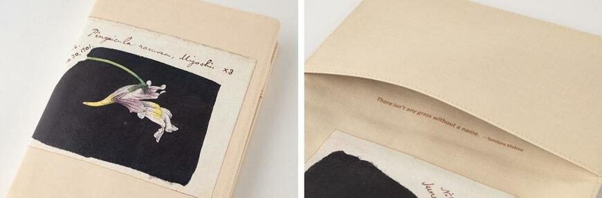 背面ポケット付きのカバーです。ポケットの内側には「我が国には、名なし草などという植物は一本もない」という牧野博士の名言の英訳がデザインされています。