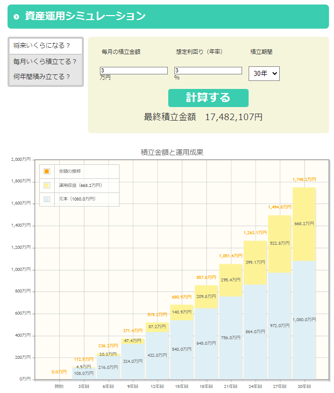 たとえば、毎月3万円の積立投資を年利3%で30年間運用すれば、約1750万円もの資産を築けます。
