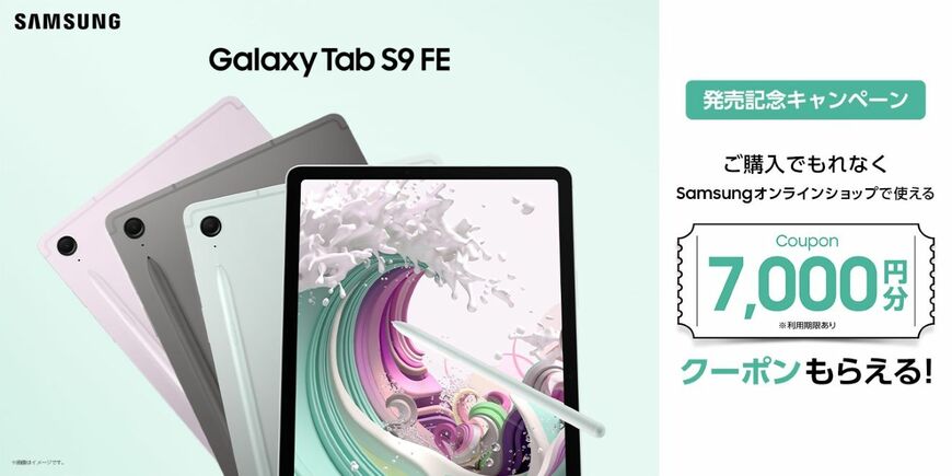 以下の対象期間および対象販路にて、「Galaxy Tab S9 FE」を購入した者全員にSamsungオンラインショップクーポン7000円分がプレゼントされる。