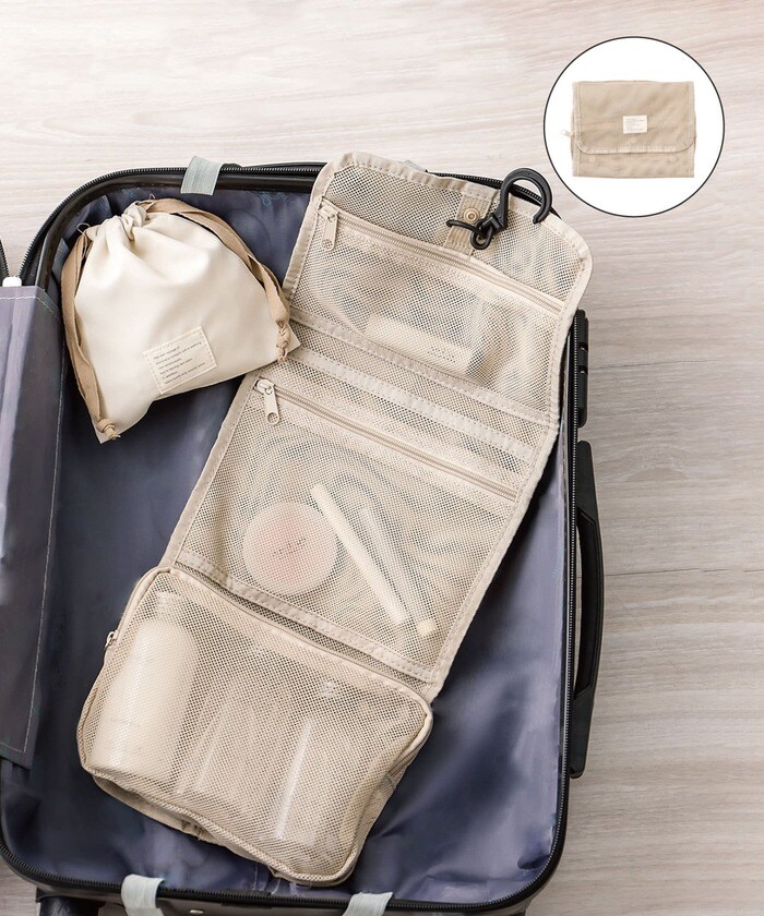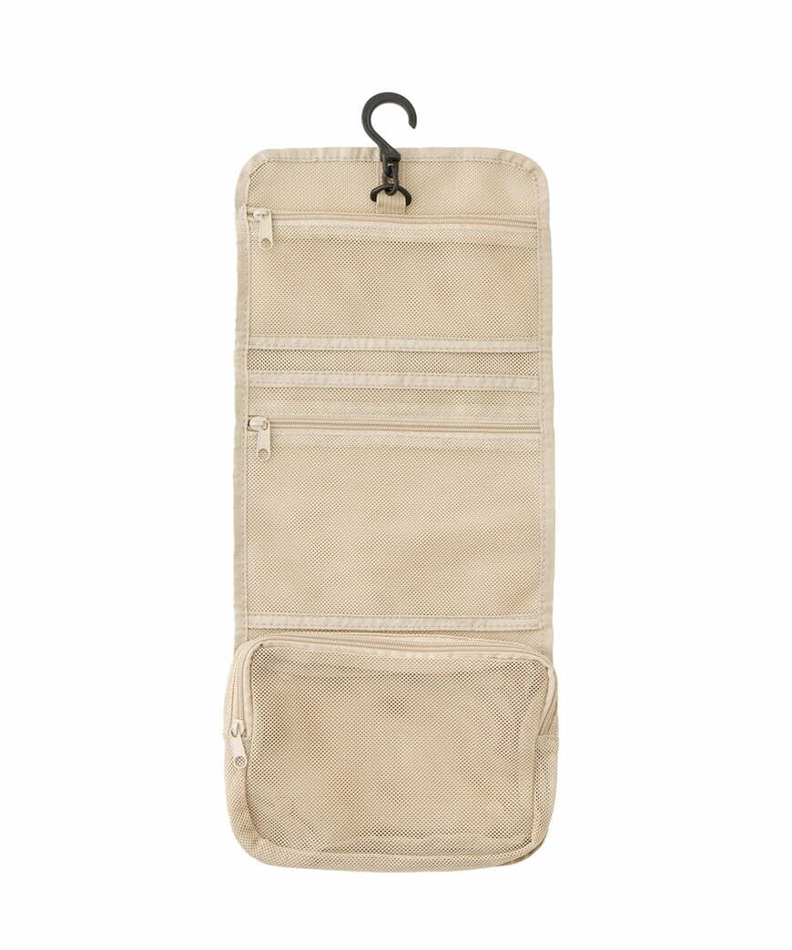 上部につけられたフックを壁やポールに引っかけて使える、吊り下げタイプの収納ポーチです。内側にメッシュ素材のポーチやポケットが3段でついていることで、小物類を迷子にさせずに収納することができます。