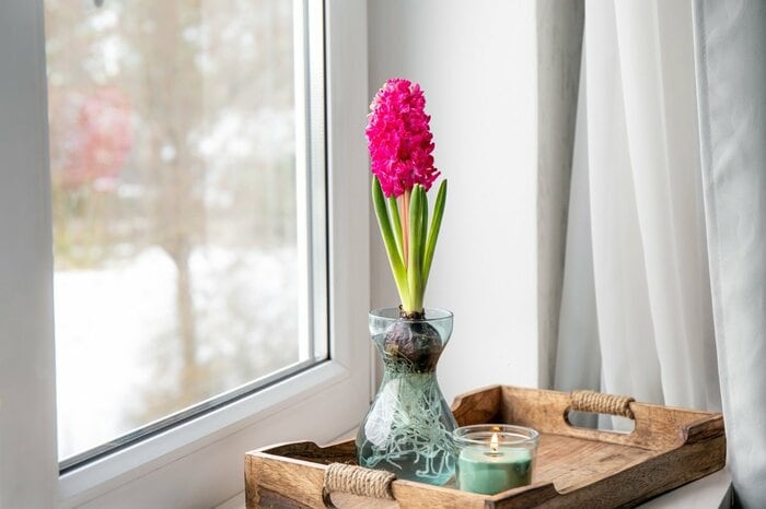 ヒヤシンスは花を長く楽しめるのが魅力。寒い場所を好む花なので、発根・発芽後も涼しい場所で育てるようにします。3~4月に開花し約1カ月間花を咲かせ続けますが、環境があうと根元に二度目のツボミをつけることも。