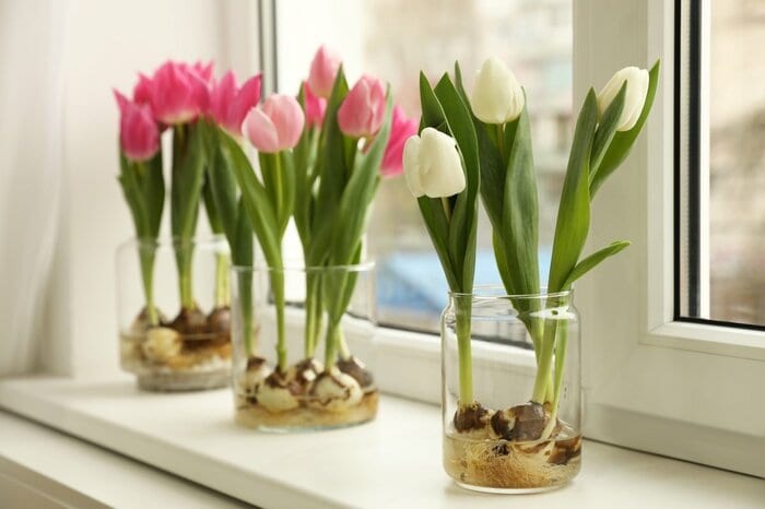 春の訪れを知らせる花、チューリップも水耕栽培に適した植物。水に浸ける前に球根の表皮を剥き、芽が出るまでは涼しい場所で、発芽が確認できたら暖かい場所に移動させましょう。