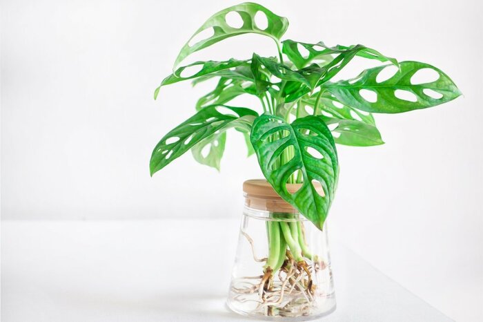 その名のとおり、窓のような穴がある葉がユニークなマドカズラ。生命力が強く、初めての水耕栽培でも成功しやすい観葉植物です。大きく成長したら土に植え替えて育てるのもおすすめ。