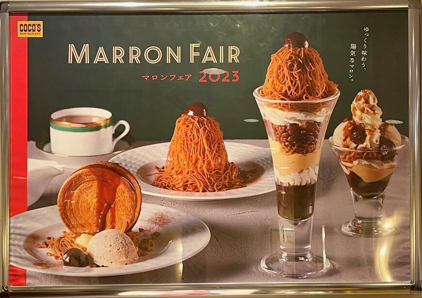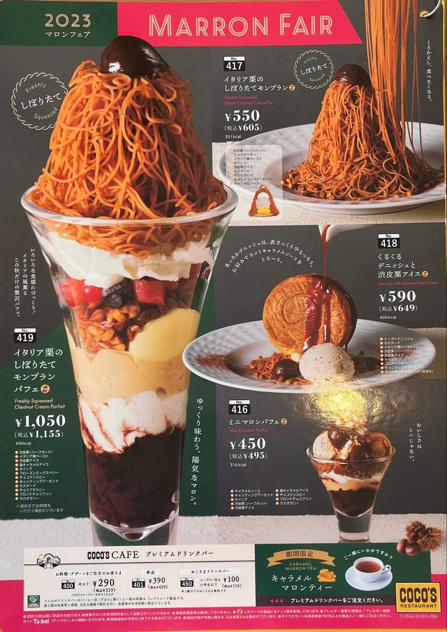 ファミリーレストランチェーン・COCO'Sでは2023年10月12日よりマロンフェアのしぼりたてモンブランが期間限定販売されています。