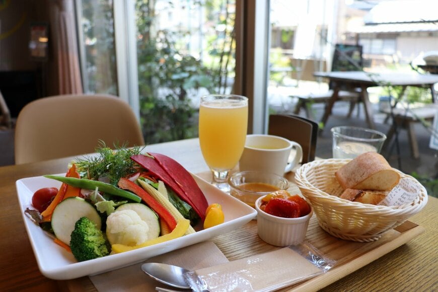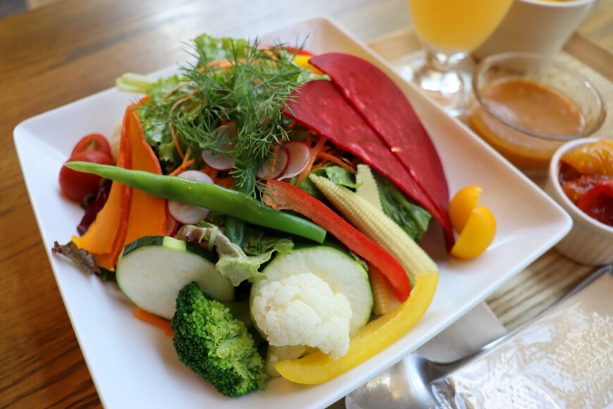 サラダプレートは、八王子市小比企町の中西ファームさんで収穫された季節の野菜をメインに、約15種類以上の野菜を使用。ドレッシングも付いていますが、そのまま食べても野菜の甘みをしっかり感じることができますよ。