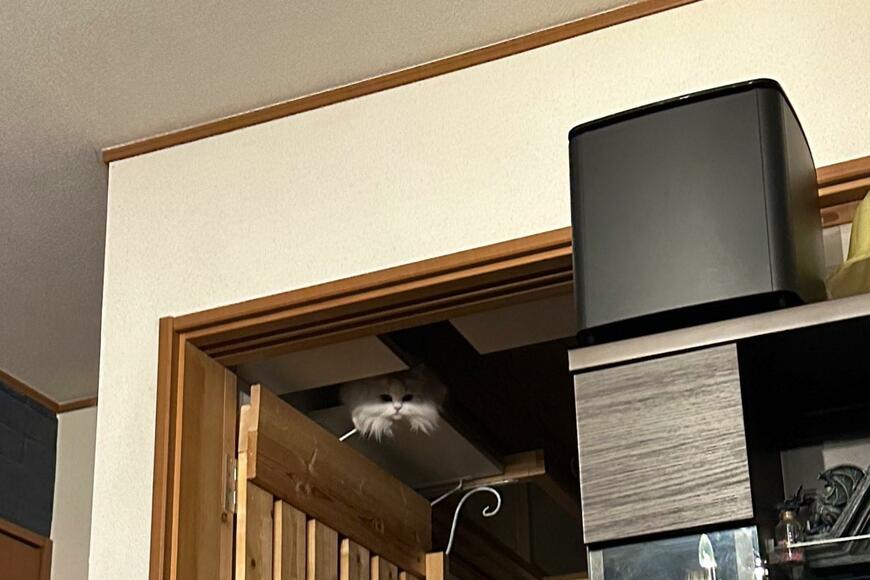 そこに写っているのは「ノーマン」くんという猫の男の子。隣の部屋のドア近くの、キャットウォークらしき場所にポジショニングし、見下ろすようにこちらを見つめています。