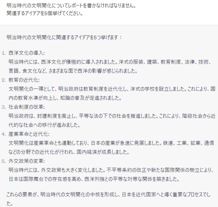 今回は試しに「明治維新の文明開化についてレポートを書かなければなりません。関連するアイデアを5個挙げてください」とChatGPTに投げかけたところ、以下のような回答が提示されました。